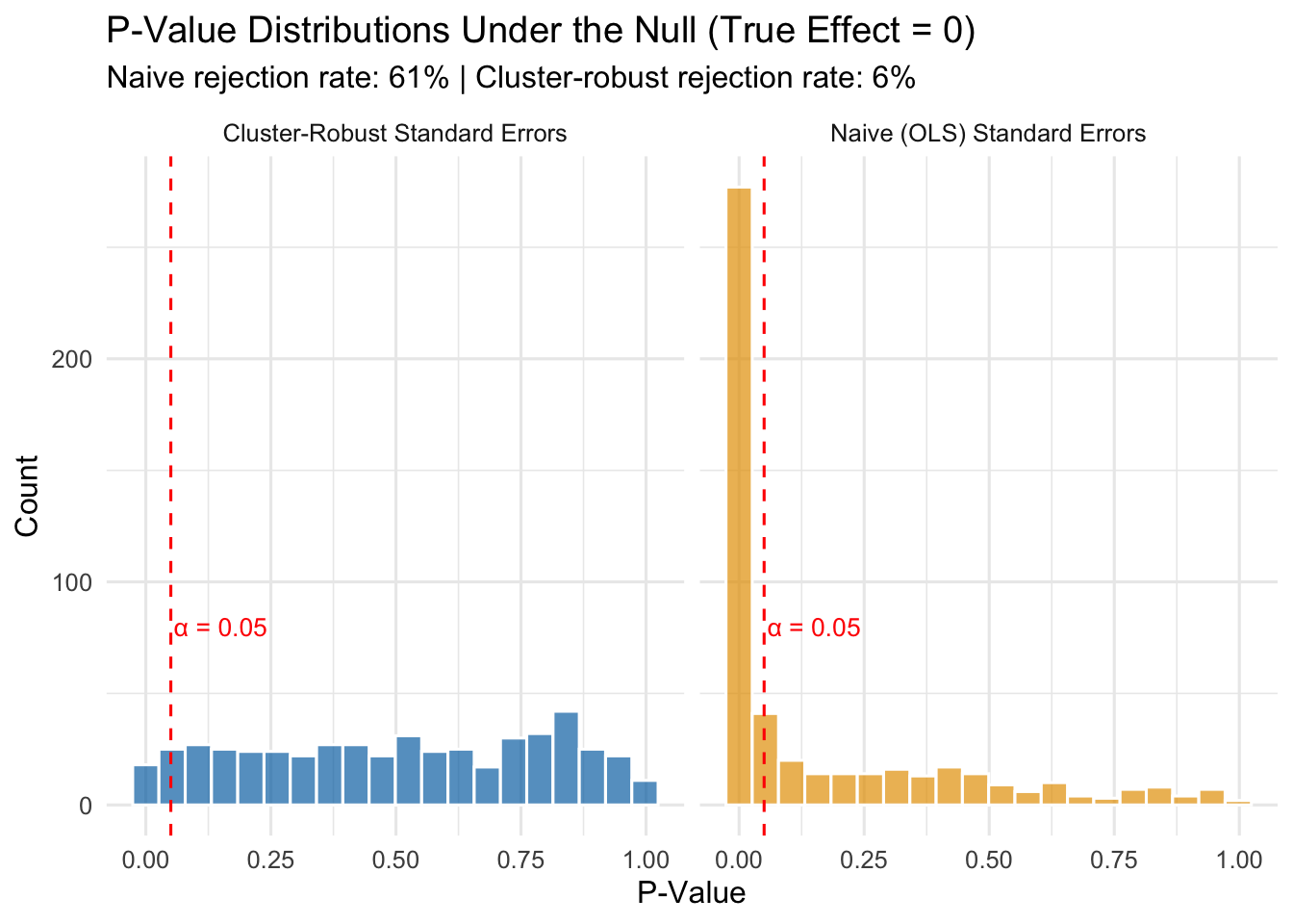 - With naive standard errors: We reject the null 61% of the time (should be 5%)