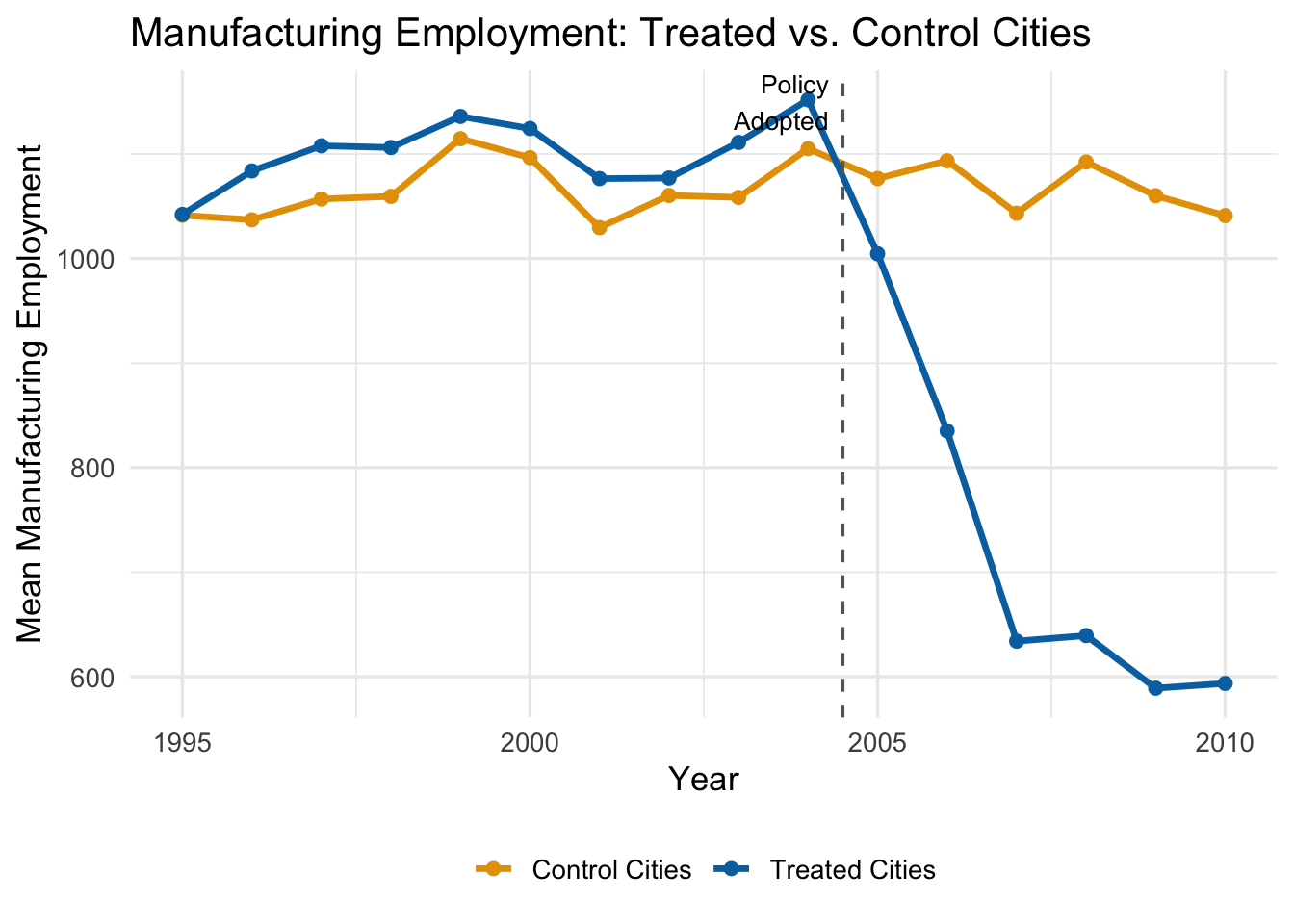 Suppose we want to estimate how an environmental regulation affects manufacturing employment in cities. We have data on 50 cities observed from 1995 to 2010, with 25 cities adopting the policy in 2005.