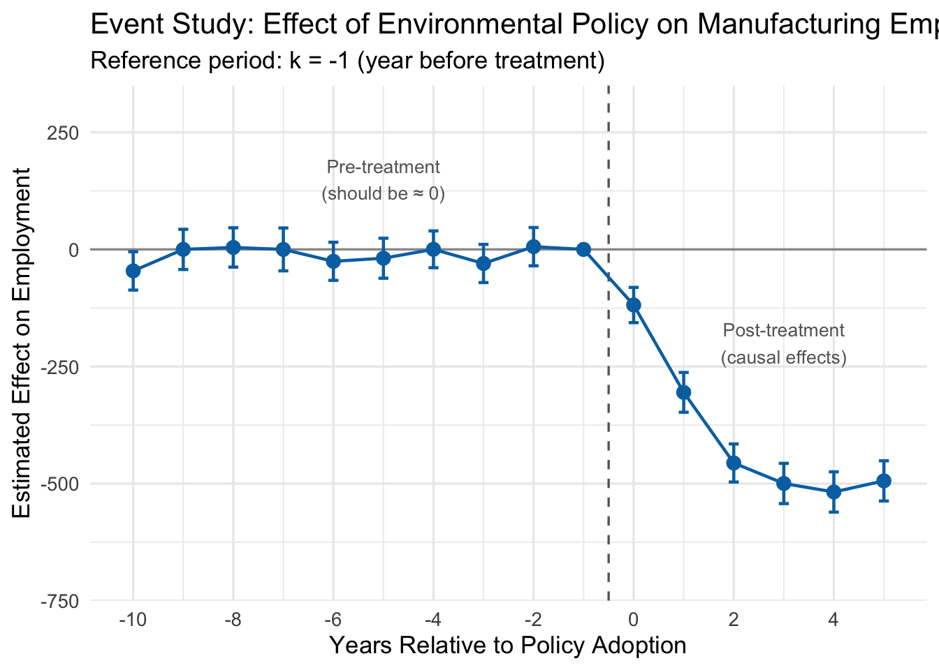 The pre-treatment coefficients serve as a placebo test. If we found large, significant “effects” before the policy was implemented, that would suggest our control group is invalid—the groups were already diverging for reasons unrelated to the treatment.