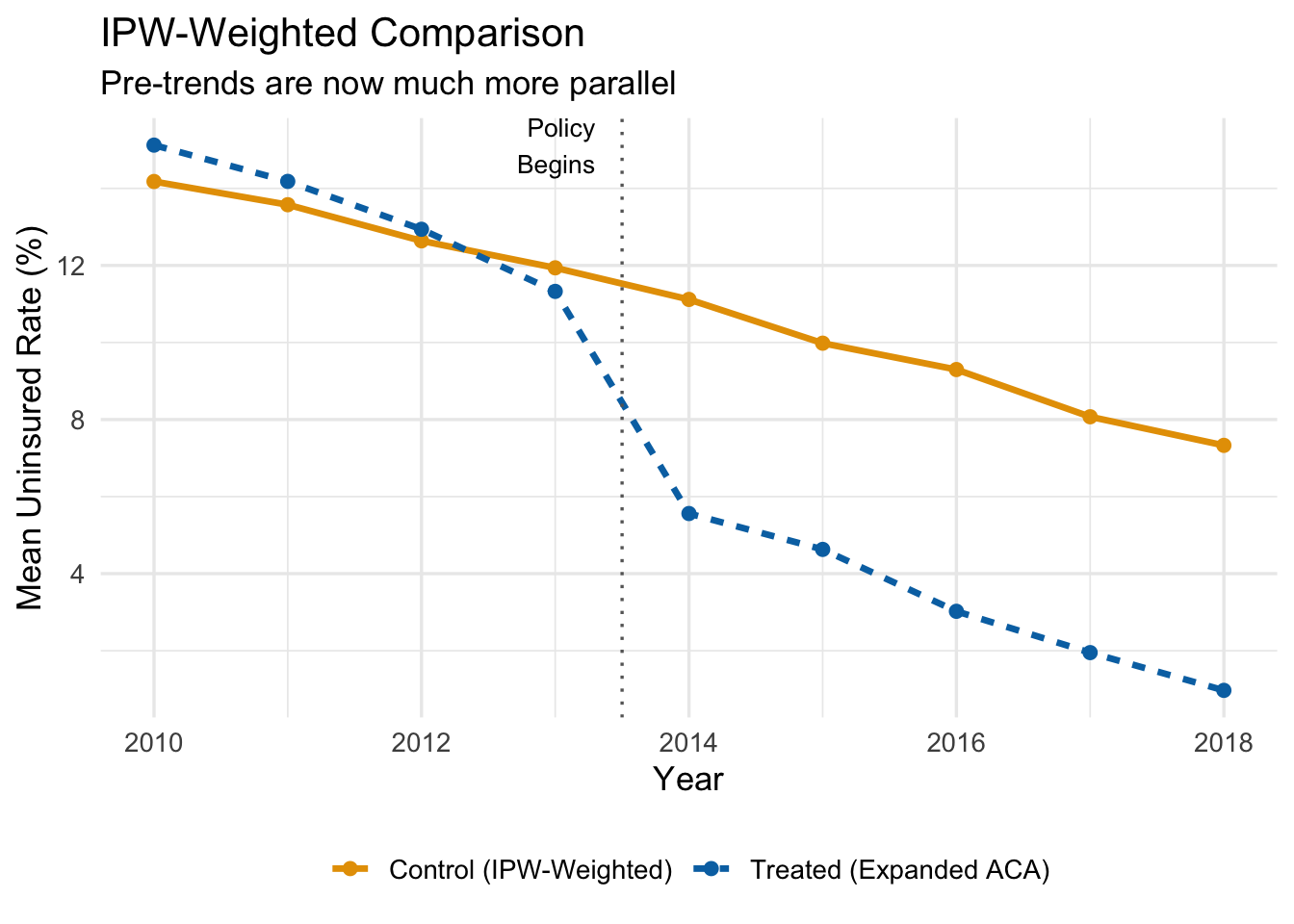 The IPW-weighted trends are much more parallel in the pre-period! This gives us greater confidence in the parallel trends assumption.