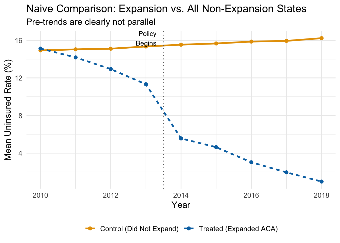The figure shows that even before the ACA expansion in 2014, treated states had steeper downward trends in uninsured rates. This pre-existing difference would be incorrectly attributed to the policy in a naive DiD analysis.