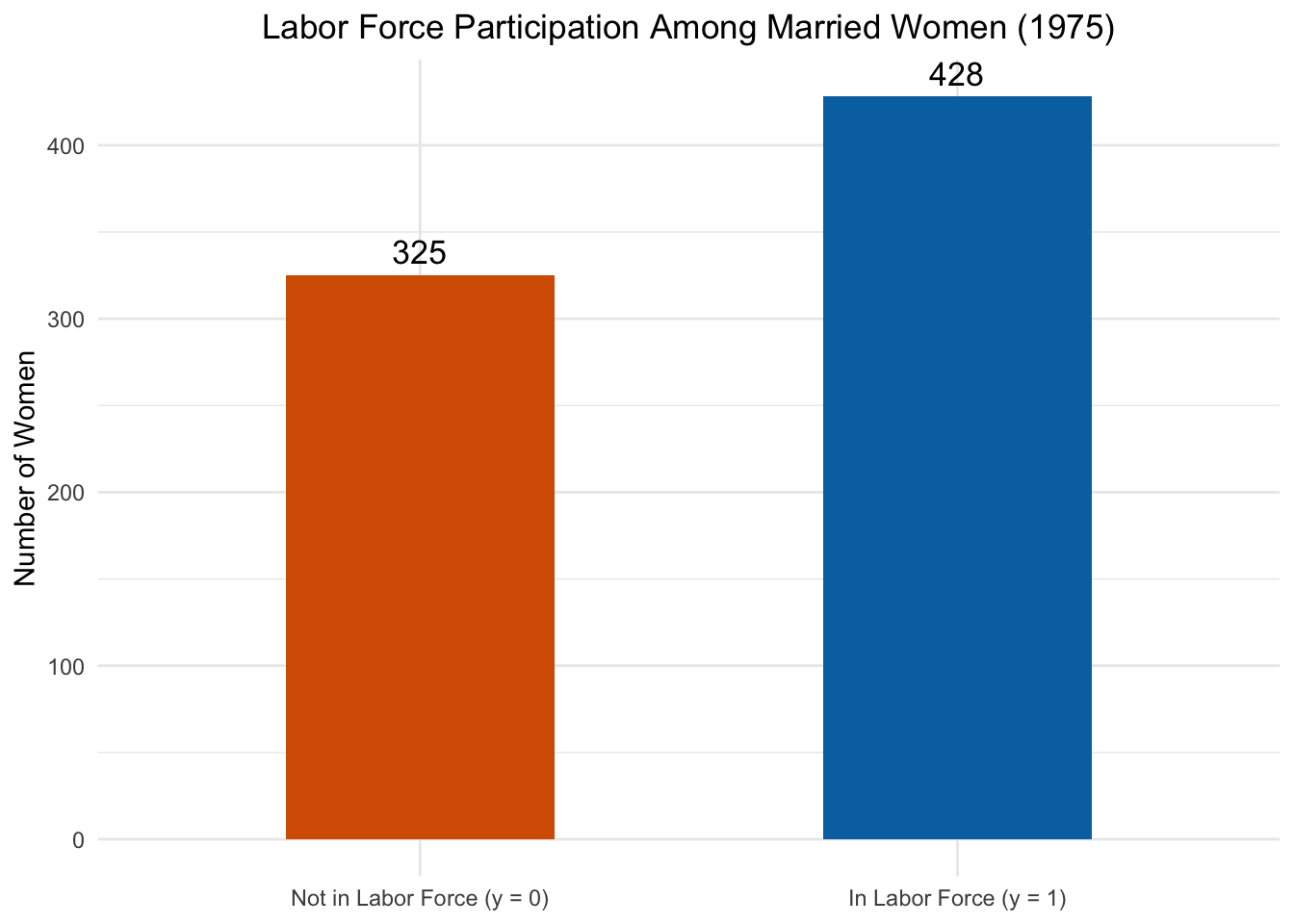lf_data <- wooldridge::mrozggplot(lf_data, aes(x =factor(inlf), fill =factor(inlf))) +geom_bar(width =0.5) +geom_text(stat ="count", aes(label =after_stat(count)), vjust =-0.5, size =4.5) +scale_fill_manual(values =c("0"="#D55E00", "1"="#0072B2"),labels =c("Not in LF", "In LF")) +scale_x_discrete(labels =c("0"="Not in Labor Force (y = 0)","1"="In Labor Force (y = 1)")) +labs(x =NULL,y ="Number of Women",title ="Labor Force Participation Among Married Women (1975)") +theme_minimal() +theme(legend.position ="none",plot.title =element_text(hjust =0.5))