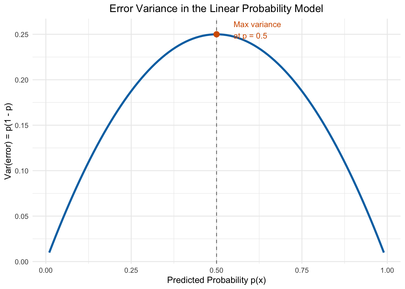 Figure 9.5: The variance of the error term in a binary outcome model depends on the predicted probability. Variance is maximized at p = 0.5 and falls toward zero as p approaches 0 or 1.