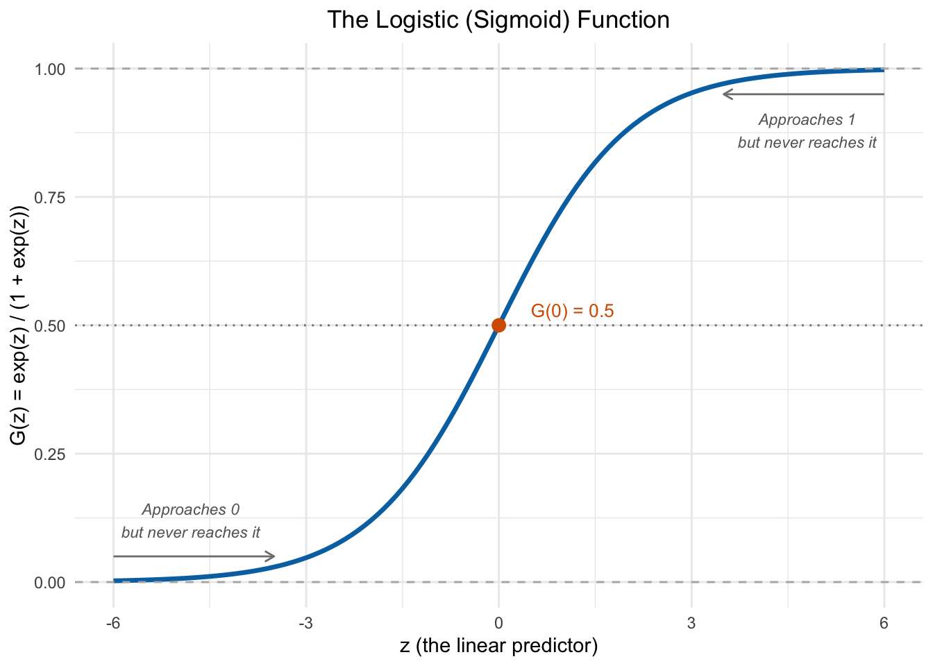 Several features of Figure 9.6 are worth noting. When \(z\) is very negative, \(G(z)\) is close to 0; when \(z\) is very positive, \(G(z)\) is close to 1; and at \(z = 0\), \(G(z) = 0.5\). Crucially, \(G(z)\) is strictly between 0 and 1 for all values of \(z\)—so the logit model can never produce impossible predicted probabilities.