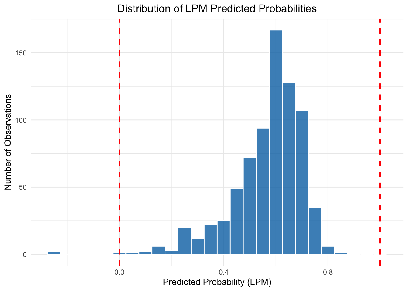 Figure 9.3: Distribution of LPM predicted probabilities. The dashed red lines mark the valid [0, 1] range. Some predictions fall below zero.