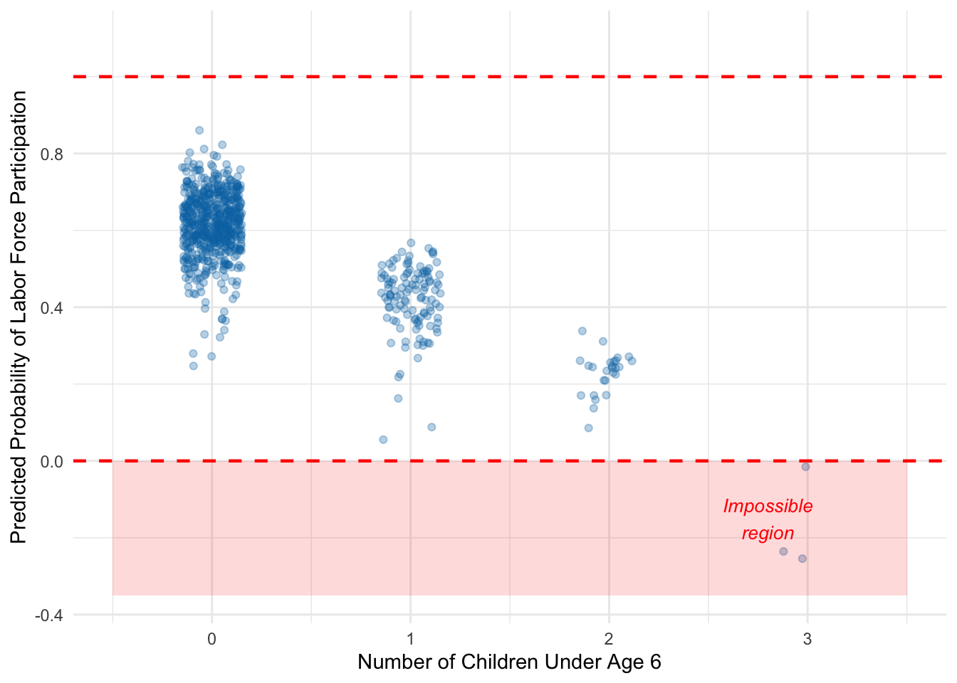 ggplot(data = lf_data) +geom_jitter(aes(x = kidslt6, y = pred), alpha =0.3, width =0.15, color ="#0072B2") +geom_hline(yintercept =0, linetype ="dashed", color ="red", linewidth =0.8) +geom_hline(yintercept =1, linetype ="dashed", color ="red", linewidth =0.8) +annotate("rect", xmin =-0.5, xmax =3.5, ymin =-0.35, ymax =0,alpha =0.15, fill ="red") +annotate("text", x =2.8, y =-0.15, label ="Impossible\nregion",color ="red", fontface ="italic", size =3.5) +coord_cartesian(ylim =c(-0.35, 1.1)) +labs(x ="Number of Children Under Age 6",y ="Predicted Probability of Labor Force Participation") +theme_minimal()