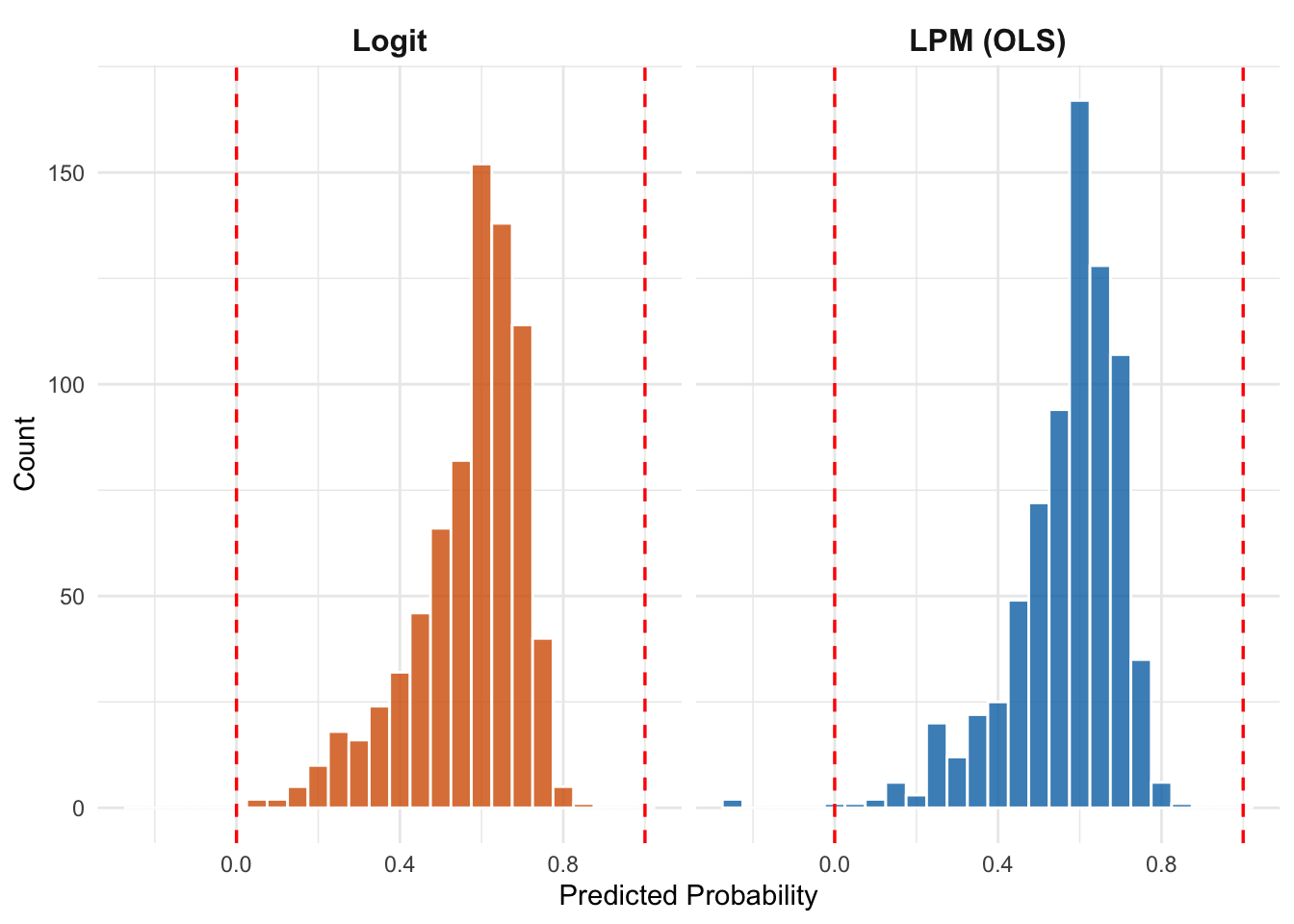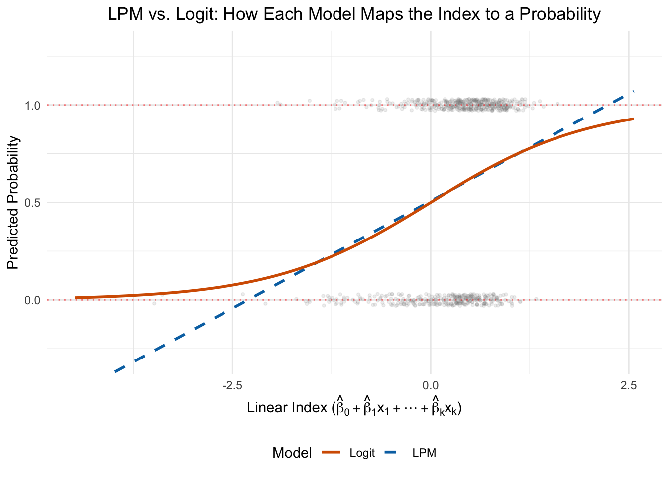 The LPM maps this index to a predicted probability using a straight line, which inevitably extends beyond the [0, 1] bounds at the extremes. The logit wraps the same index through the S-shaped logistic function, keeping all predictions between 0 and 1. In the middle range—where most of the data sits—the two models agree closely. They diverge mainly at the tails, which is exactly where the LPM’s out-of-bounds problem arises.
