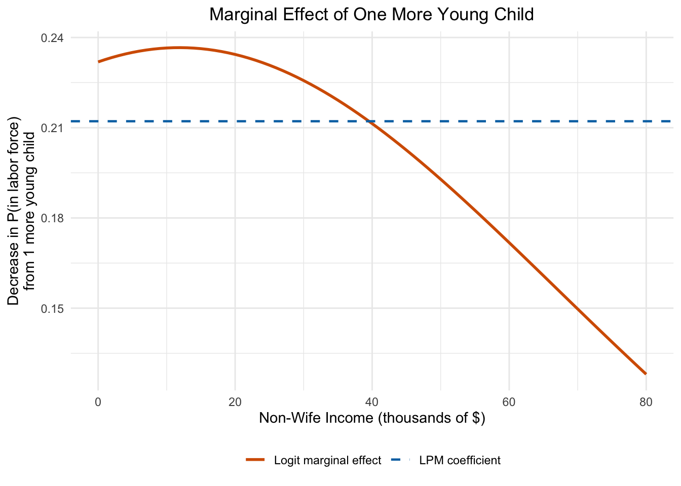 Figure 9.10: The marginal effect of one additional young child on labor force participation probability, computed at different values of non-wife income. Unlike the constant LPM effect (dashed line), the logit marginal effect varies—it is largest where the predicted probability is near 0.5.