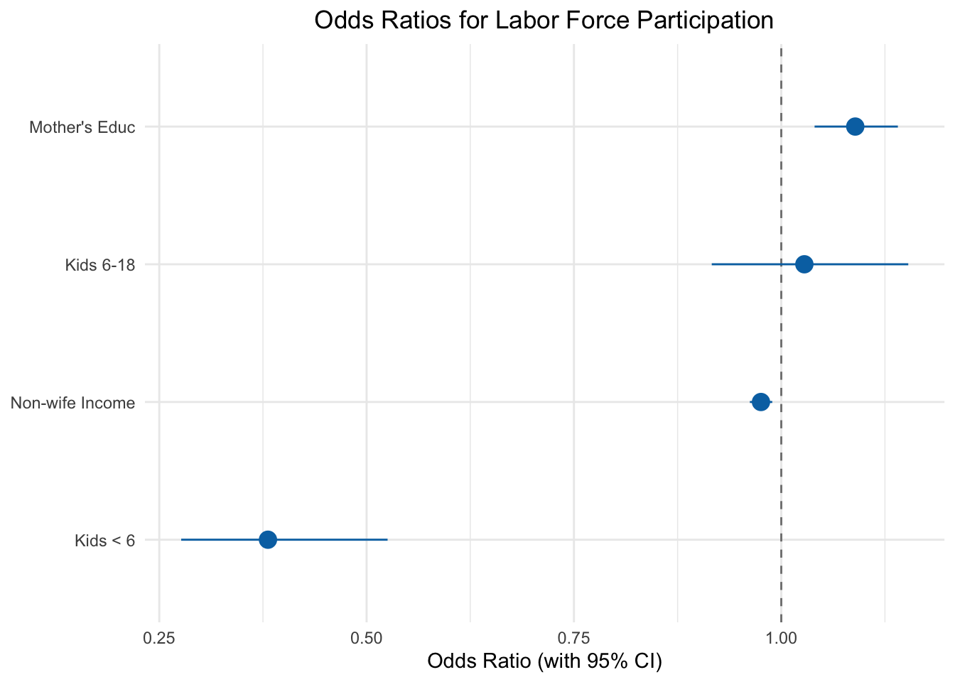 where kidslt6 is the number of children under age 6, kidsge6 is the number of children aged 6–18, nwifeinc is the wife’s non-labor income (in thousands of dollars), and motheduc is the mother’s years of education.