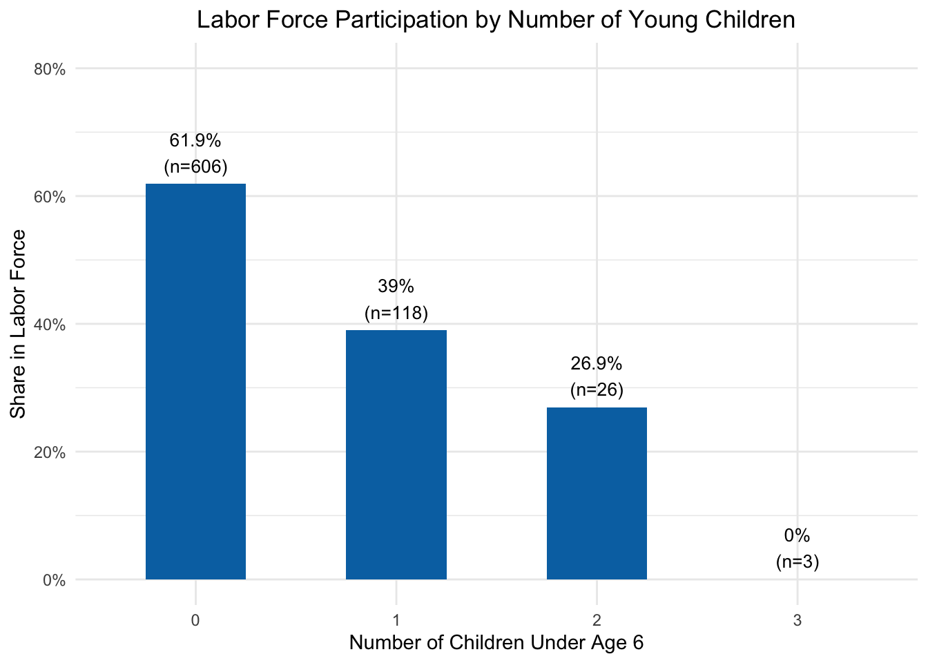 lf_data |>group_by(kidslt6) |>summarise(pct_inlf =mean(inlf),n =n()) |>ggplot(aes(x =factor(kidslt6), y = pct_inlf)) +geom_col(fill ="#0072B2", width =0.5) +geom_text(aes(label =paste0(round(pct_inlf *100, 1), "%\n(n=", n, ")")),vjust =-0.3, size =3.5) +scale_y_continuous(labels = scales::percent_format(), limits =c(0, 0.8)) +labs(x ="Number of Children Under Age 6",y ="Share in Labor Force",title ="Labor Force Participation by Number of Young Children") +theme_minimal() +theme(plot.title =element_text(hjust =0.5))