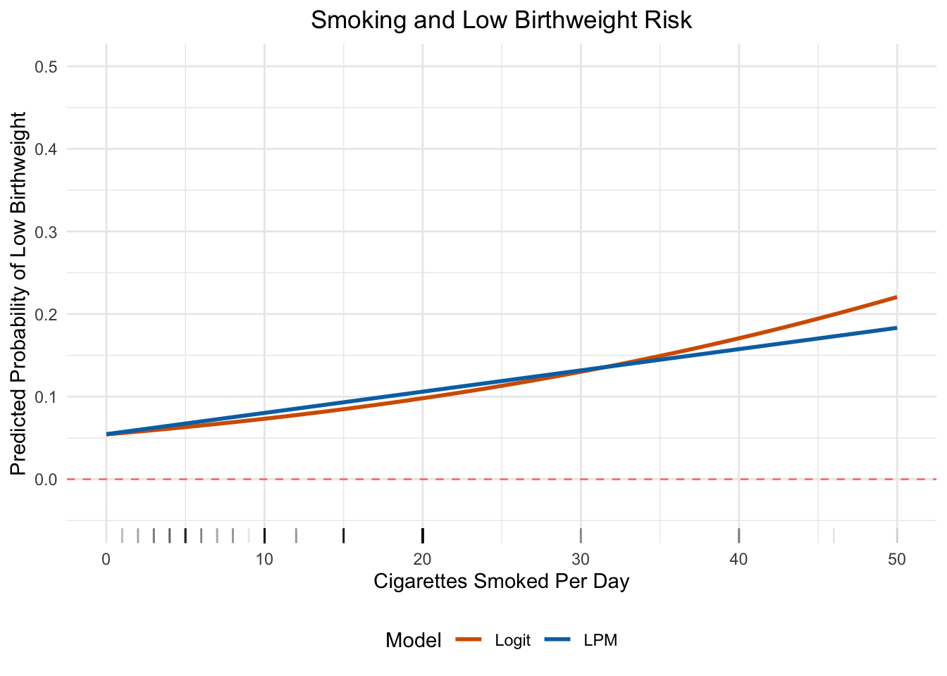Figure 9.11: Predicted probability of low birthweight by number of cigarettes smoked per day, from both the LPM and logit models. The models agree closely in the range of the data but diverge at extremes.