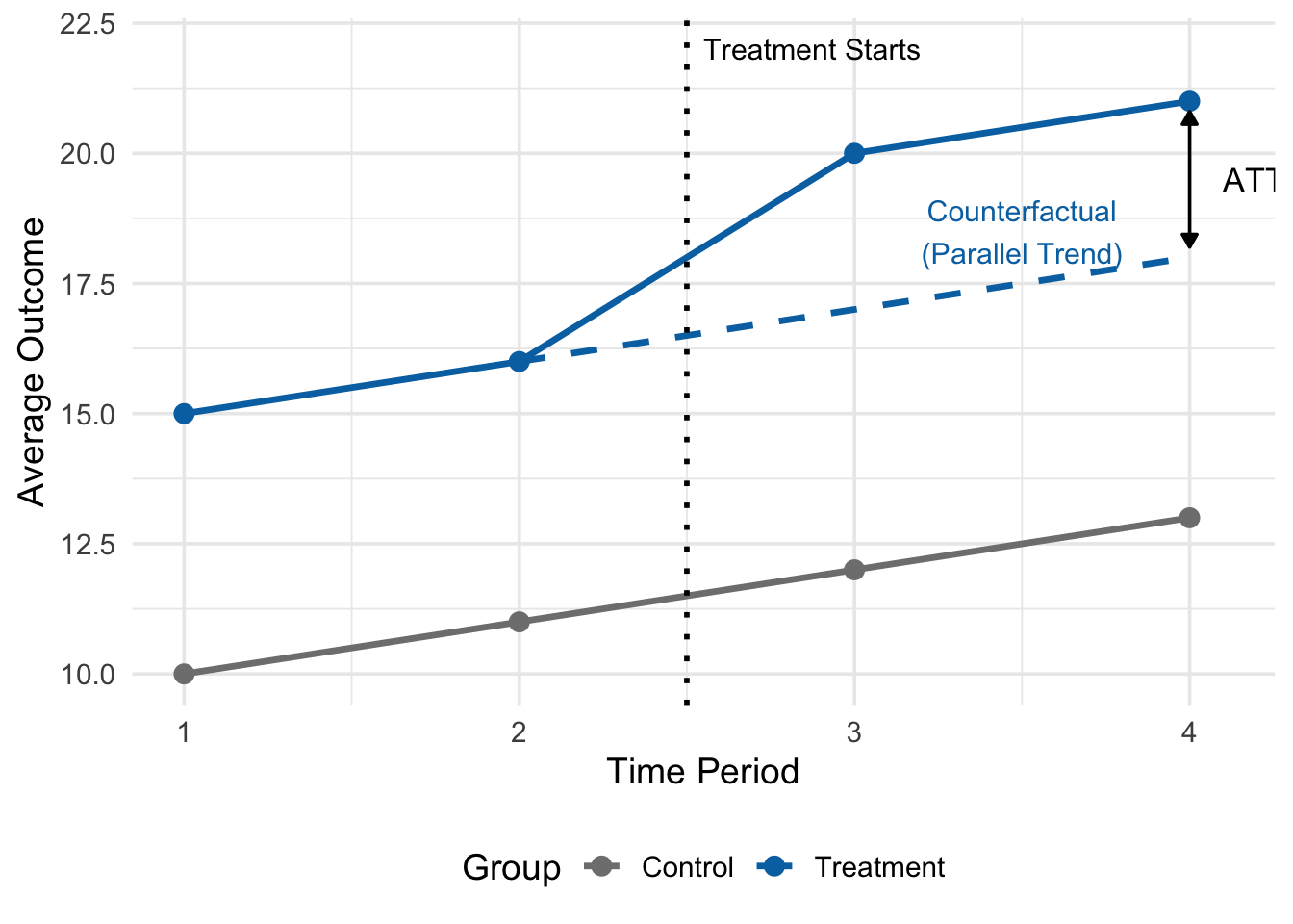 The dashed line represents this counterfactual—the treated group’s hypothetical trajectory without treatment.