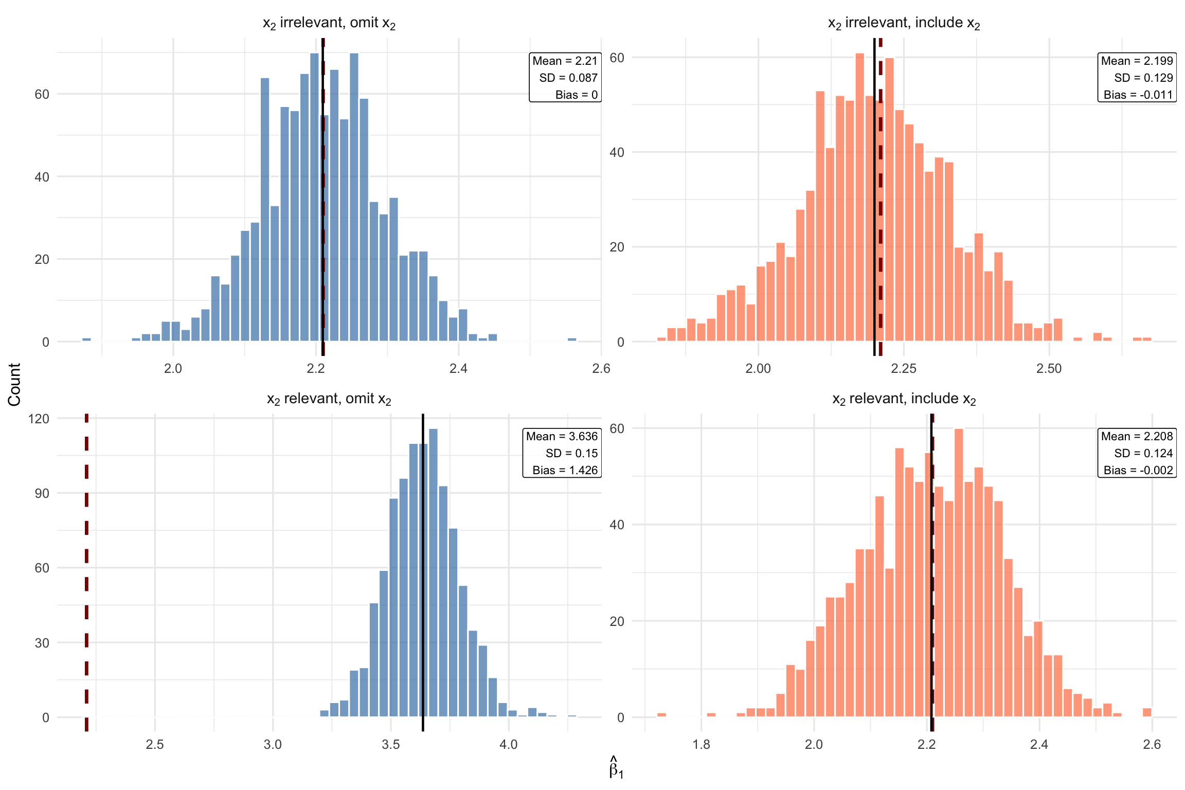 Let’s see the bias-variance tradeoff in action with a simulation. We generate two populations—one where \(x_2\) is irrelevant (\(\beta_2 = 0\)) and one where \(x_2\) is relevant (\(\beta_2 \neq 0\))—then repeatedly estimate \(\hat{\beta}_1\) using either the short model (omit \(x_2\)) or the long model (include \(x_2\)).