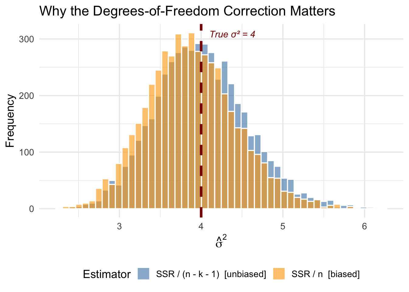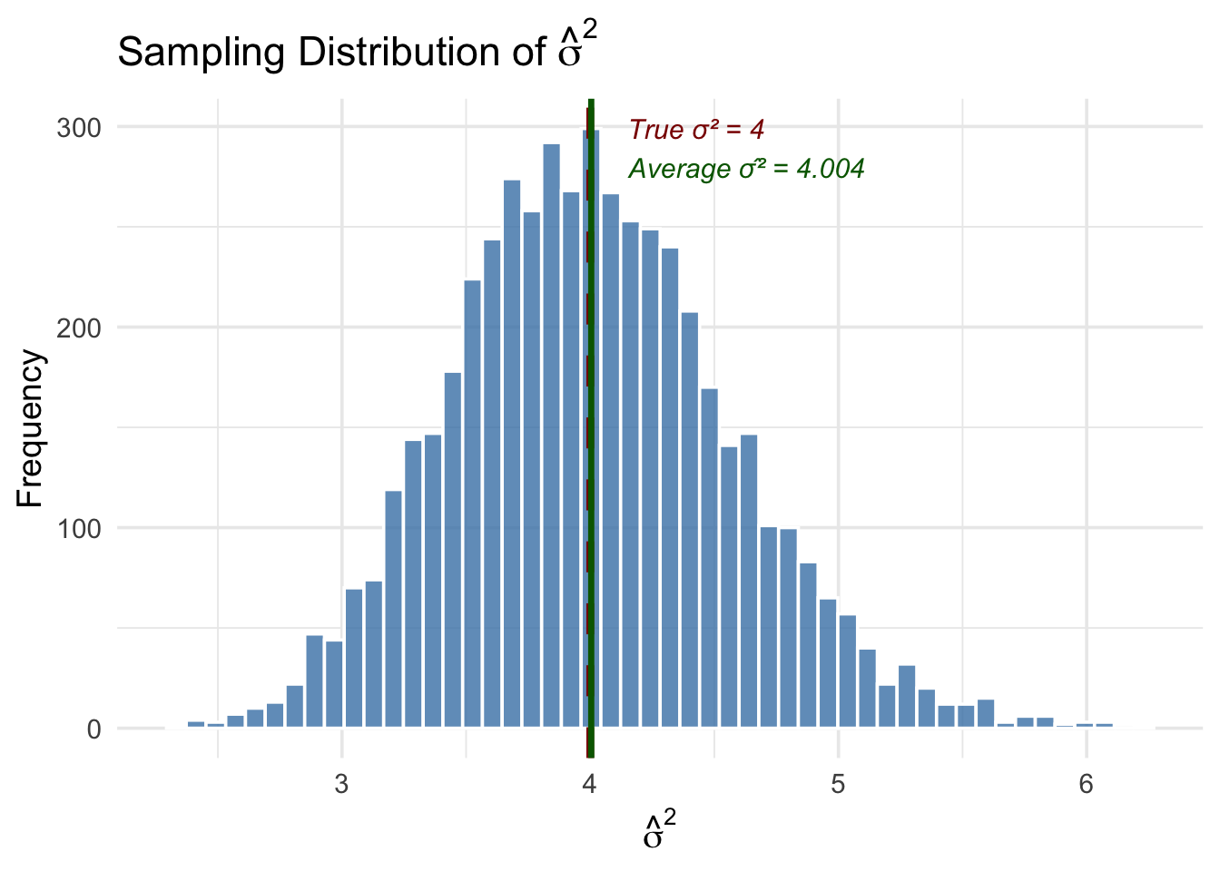 The simulation confirms two important things. First, the average of \(\hat{\sigma}^2\) across all 5,000 samples is very close to the true \(\sigma^2 = 4\)—this is unbiasedness in action. Second, while any single estimate of \(\hat{\sigma}^2\) can be above or below the true value, the distribution is centered in the right place.