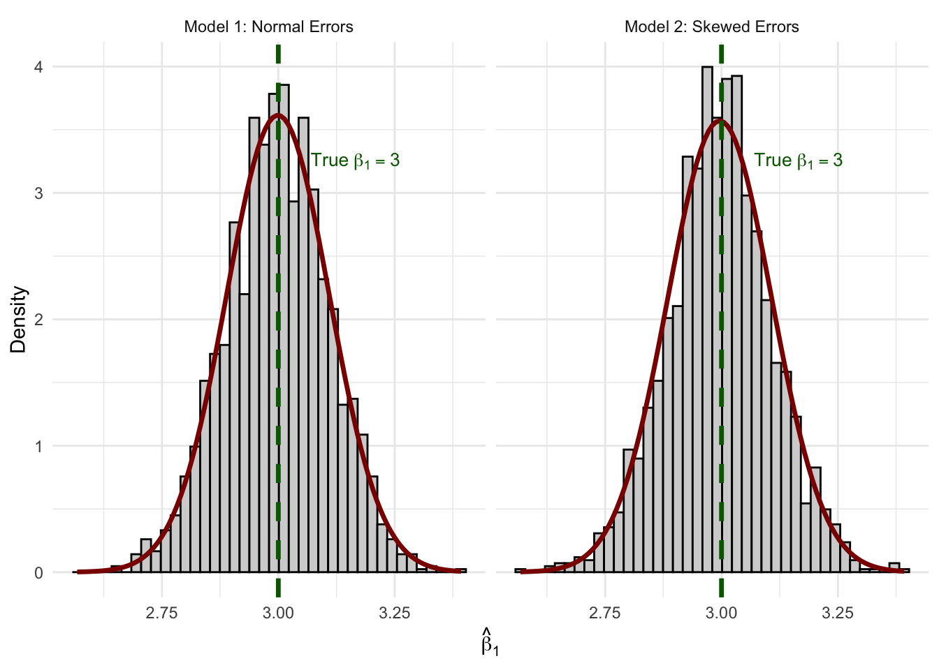 Figure 6.7: Sampling distributions of β̂₁ from 2,000 replications. Despite skewed errors in Model 2, both distributions are well-approximated by the normal curve (red).
