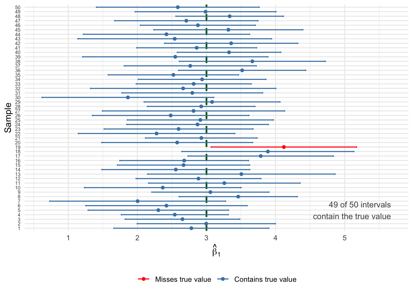 The normal curve fits both histograms remarkably well. Even with \(n = 50\) and a heavily skewed error distribution, the CLT does its work. Both sampling distributions are centered on the true value \(\beta_1 = 3\) (unbiasedness), and both are well-approximated by a normal density.