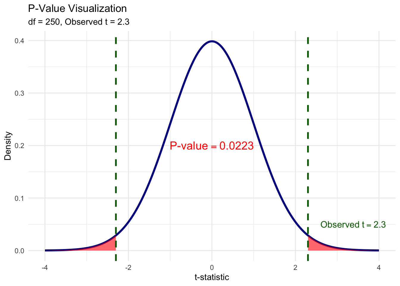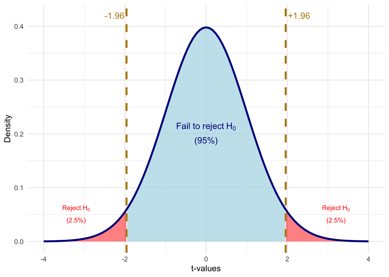 # Calculate critical value for 5% significance, two-sidedalpha <-0.05c_val <-1.96# Create shading data for rejection regionst_grid <-seq(-4, 4, length.out =500)t_dens <-dt(t_grid, df = df_value)shade_data <-tibble(t_value = t_grid, density = t_dens) |>mutate(region =case_when( t_value <-c_val ~"reject", t_value > c_val ~"reject",TRUE~"fail_to_reject" ) )ggplot() +# Fail to reject region (blue)geom_ribbon(data = shade_data |>filter(region =="fail_to_reject"),aes(x = t_value, ymin =0, ymax = density),fill ="lightblue", alpha =0.7) +# Left rejection region (red)geom_ribbon(data = shade_data |>filter(t_value <=-c_val),aes(x = t_value, ymin =0, ymax = density),fill ="red", alpha =0.5) +# Right rejection region (red)geom_ribbon(data = shade_data |>filter(t_value >= c_val),aes(x = t_value, ymin =0, ymax = density),fill ="red", alpha =0.5) +# Distribution curvestat_function(fun = dt, args =list(df = df_value),color ="darkblue", linewidth =1.2) +# Critical value linesgeom_vline(xintercept =c(-c_val, c_val),color ="darkgoldenrod", linewidth =1.2, linetype ="dashed") +# Annotationsannotate("text", x =-c_val, y =0.42,label =paste0("-", round(c_val, 2)),color ="darkgoldenrod", size =4, hjust =1.1) +annotate("text", x = c_val, y =0.42,label =paste0("+", round(c_val, 2)),color ="darkgoldenrod", size =4, hjust =-0.1) +annotate("text", x =0, y =0.2,label ="atop('Fail to reject'~H[0], '(95%)')", parse =TRUE,color ="darkblue", size =4) +annotate("text", x =3.2, y =0.05,label ="atop('Reject'~H[0], '(2.5%)')", parse =TRUE,color ="red", size =3) +annotate("text", x =-3.2, y =0.05,label ="atop('Reject'~H[0], '(2.5%)')", parse =TRUE,color ="red", size =3) +labs(x ="t-values", y ="Density") +coord_cartesian(xlim =c(-4, 4)) +theme_minimal()