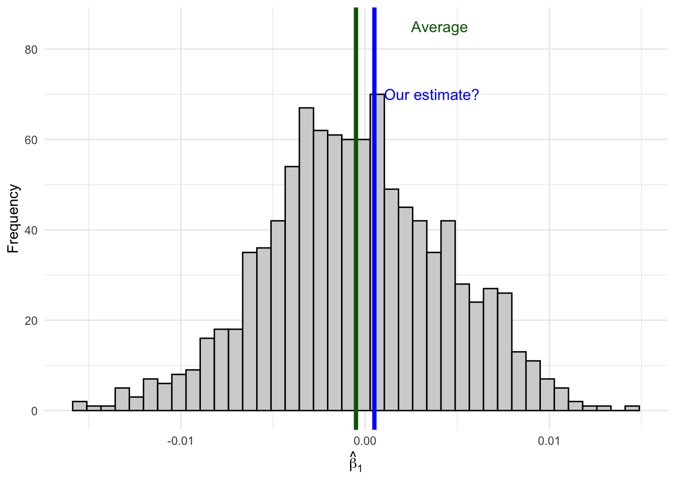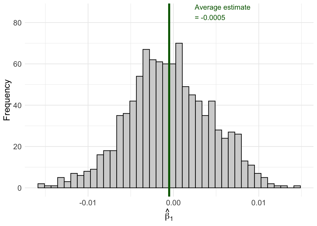 set.seed(124890)# Create our "population" datapop_data <-tibble(x =sample(1:100, size =1000, replace =TRUE),err =rnorm(1000),y =2.45+0* x + err # True beta_1 = 0)# Number of simulation repetitionsn_sims <-1000# Run the simulationsim_results <-map_dfr(1:n_sims, function(i) {# Draw a random sample of 50 observations sample_data <- pop_data |>slice_sample(n =50, replace =TRUE)# Estimate OLS regression reg <-lm(y ~ x, data = sample_data)# Store the estimatetibble(iteration = i,b1_hat =coef(reg)["x"] )})# Calculate the average estimateavg_estimate <-mean(sim_results$b1_hat)# Create the visualizationggplot(sim_results, aes(x = b1_hat)) +geom_histogram(fill ="lightgrey", color ="black", bins =40) +geom_vline(xintercept = avg_estimate, color ="darkgreen", linewidth =1.5) +annotate("text", x = avg_estimate +0.003, y =85,label =paste0("Average estimate\n= ", round(avg_estimate, 4)),color ="darkgreen", size =4, hjust =0) +labs(x =expression(hat(beta)[1]),y ="Frequency" ) +theme_minimal() +theme(axis.text =element_text(size =12),axis.title =element_text(size =14) )