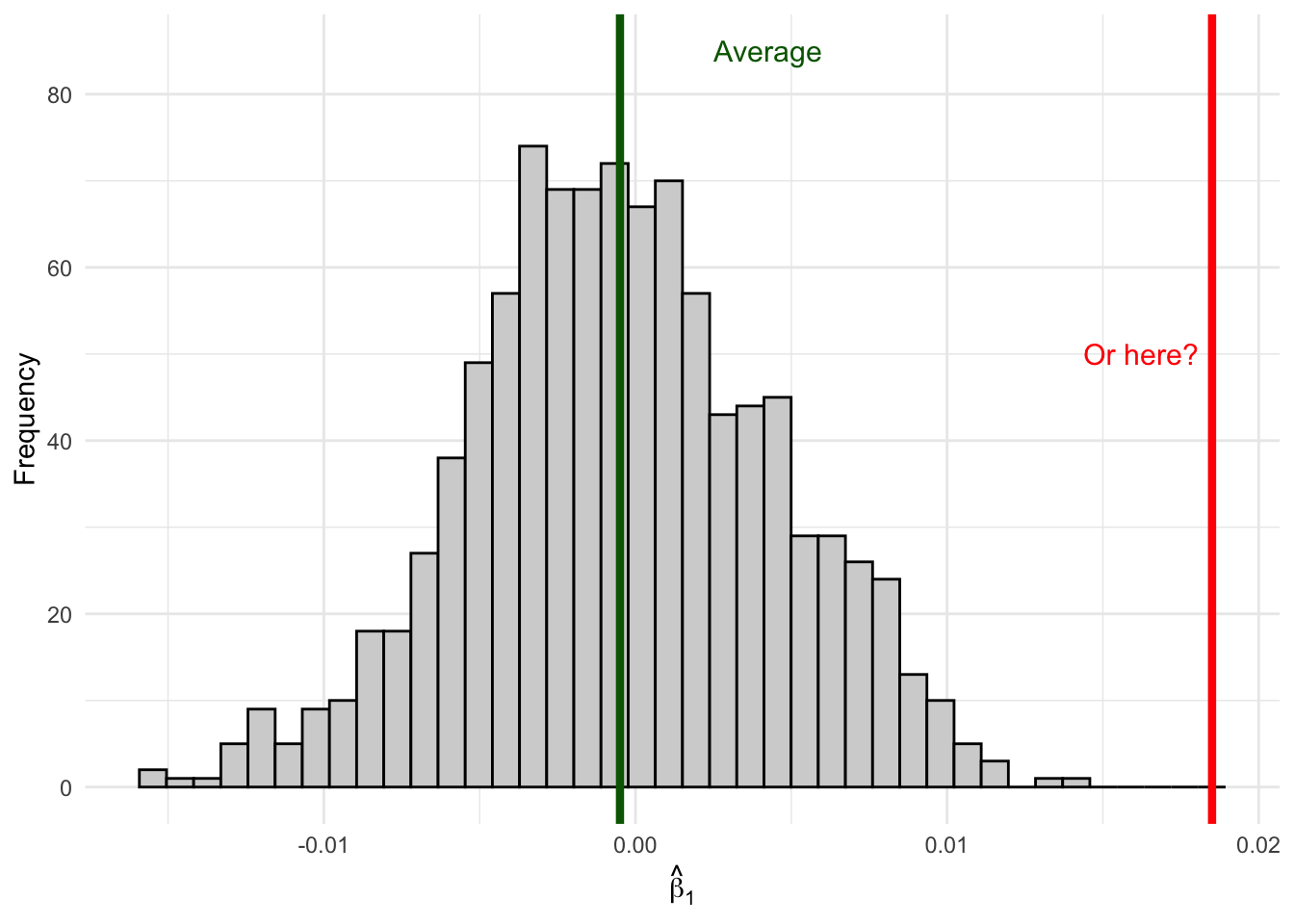 Now imagine you only have access to one sample—as is always the case in practice. You run your regression and get an estimate of, say, \(\hat{\beta}_1 = 0.001\).