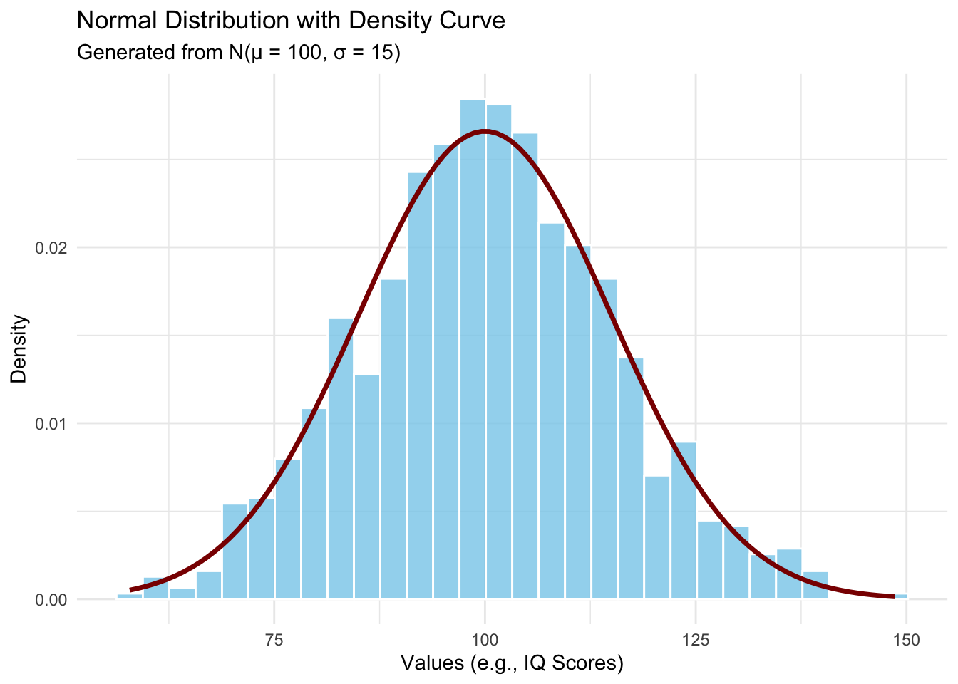 set.seed(123)mu <-100sigma <-15normal_data <-tibble(values =rnorm(n =1000, mean = mu, sd = sigma))ggplot(normal_data, aes(x = values)) +geom_histogram(aes(y =after_stat(density)),bins =30,fill ="skyblue",color ="white",alpha =0.8) +stat_function(fun = dnorm,args =list(mean = mu, sd = sigma),color ="darkred",linewidth =1.2) +labs(title ="Normal Distribution with Density Curve",subtitle =paste0("Generated from N(μ = ", mu, ", σ = ", sigma, ")"),x ="Values (e.g., IQ Scores)",y ="Density" ) +theme_minimal()