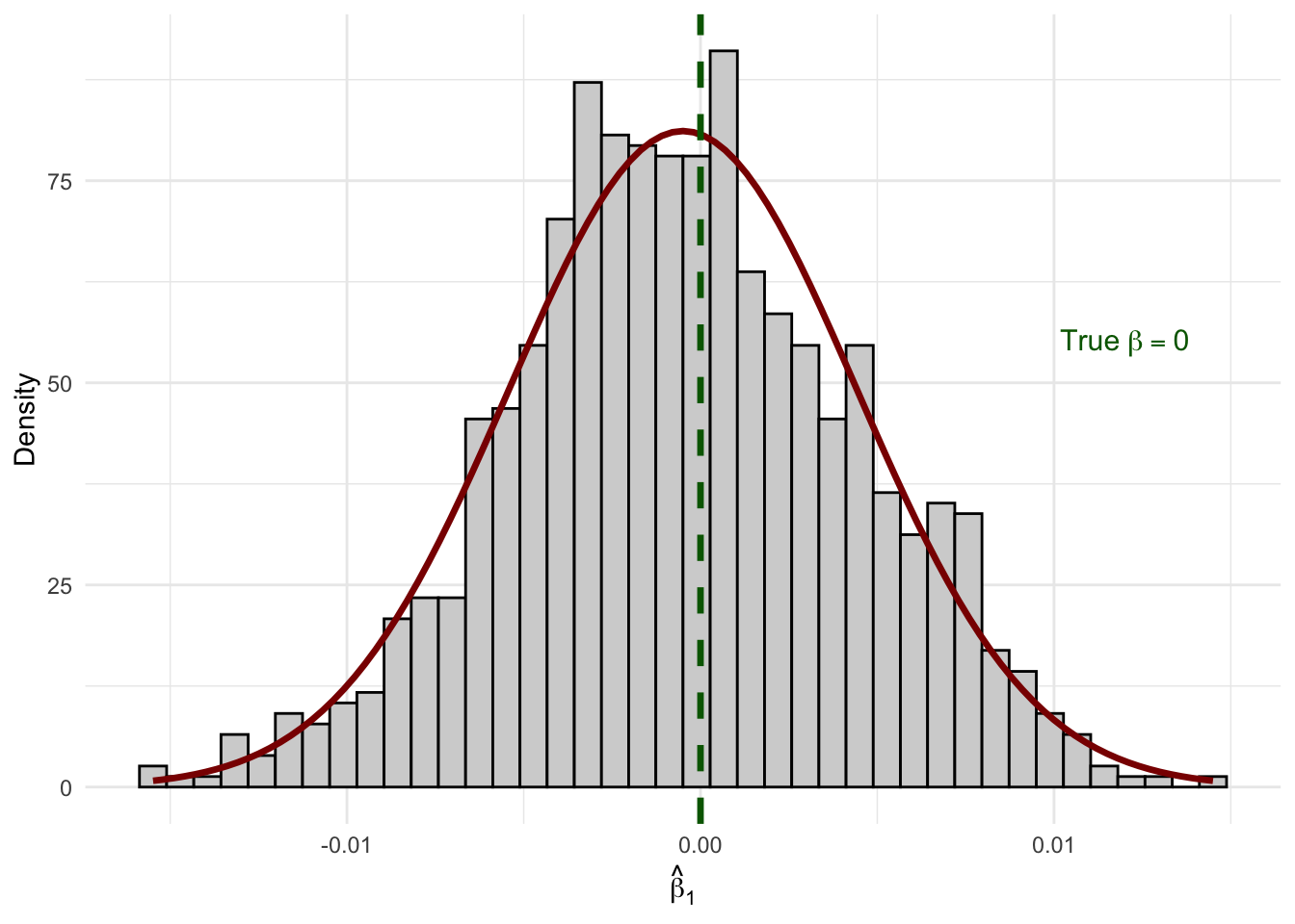 # Overlay a normal density on our simulation resultsggplot(sim_results, aes(x = b1_hat)) +geom_histogram(aes(y =after_stat(density)),fill ="lightgrey", color ="black", bins =40) +stat_function(fun = dnorm,args =list(mean =mean(sim_results$b1_hat),sd =sd(sim_results$b1_hat)),color ="darkred",linewidth =1.2 ) +geom_vline(xintercept =0, color ="darkgreen", linewidth =1.2, linetype ="dashed") +annotate("text", x =0.012, y =55,label ="True~beta == 0", parse =TRUE, color ="darkgreen", size =4) +labs(x =expression(hat(beta)[1]),y ="Density" ) +theme_minimal()