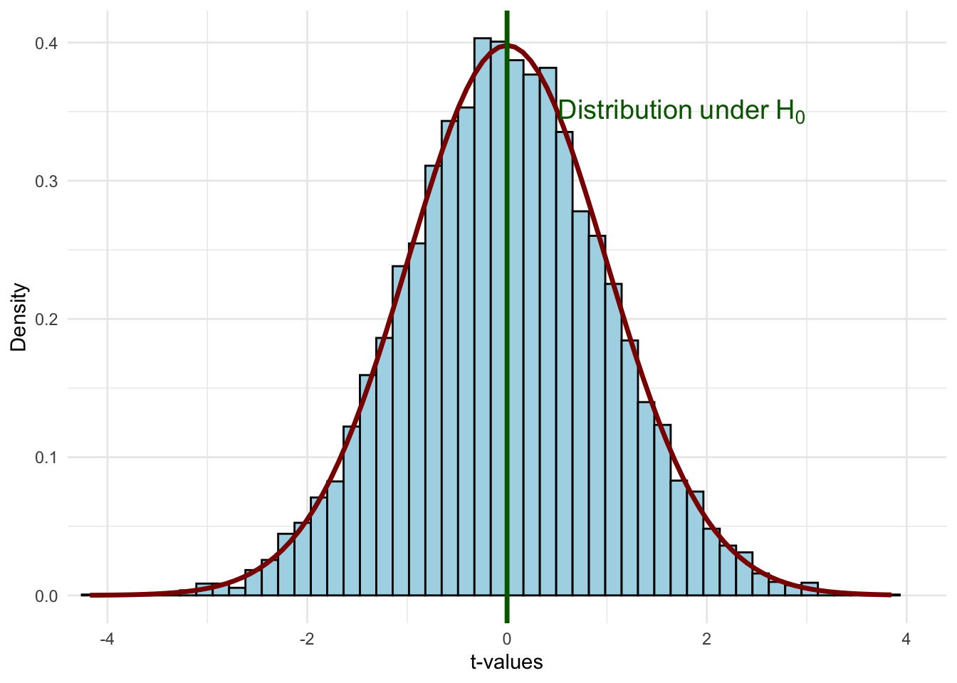 Figure 6.8: The t-distribution under the null hypothesis H₀: βⱼ = 0. If the null is true, most standardized estimates will fall near zero.