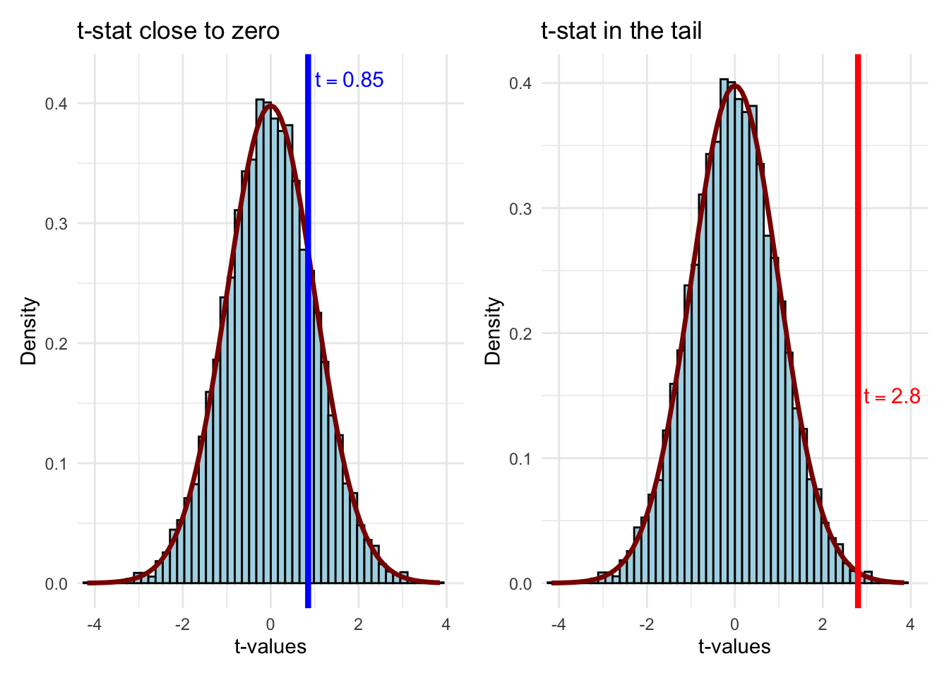 p_close <-ggplot(t_sample, aes(x = t_value)) +geom_histogram(aes(y =after_stat(density)),bins =50, fill ="lightblue", color ="black") +stat_function(fun = dt, args =list(df = df_value),color ="darkred", linewidth =1.2) +geom_vline(xintercept =0.85, color ="blue", linewidth =1.5) +annotate("text", x =0.85, y =0.42, label ="t == 0.85",parse =TRUE, color ="blue", size =4, hjust =-0.1) +labs(x ="t-values", y ="Density", title ="t-stat close to zero") +coord_cartesian(xlim =c(-4, 4)) +theme_minimal()p_far <-ggplot(t_sample, aes(x = t_value)) +geom_histogram(aes(y =after_stat(density)),bins =50, fill ="lightblue", color ="black") +stat_function(fun = dt, args =list(df = df_value),color ="darkred", linewidth =1.2) +geom_vline(xintercept =2.8, color ="red", linewidth =1.5) +annotate("text", x =2.8, y =0.15, label ="t == 2.8",parse =TRUE, color ="red", size =4, hjust =-0.1) +labs(x ="t-values", y ="Density",title ="t-stat in the tail") +coord_cartesian(xlim =c(-4, 4)) +theme_minimal()p_close + p_far