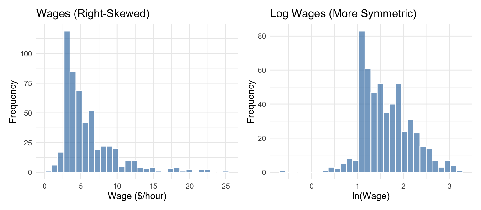 The key insight for logs: differences in logs ≈ percentage changes. A change of 0.05 in ln(wage) corresponds to approximately a 5% change in wage. Multiply by 100 to convert to percentage.