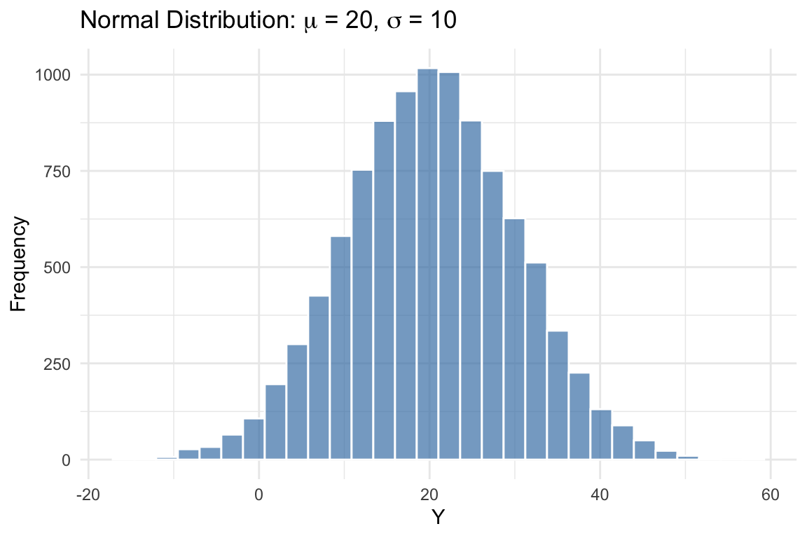 The normal distribution has a characteristic “bell curve” shape: symmetric around the mean, with most observations clustered near the center and fewer observations in the tails.