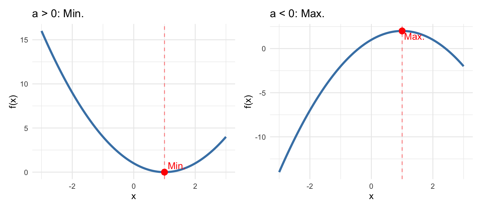 | Critical point (quadratic) | \(x^* = -\frac{b}{2a}\) for \(f(x) = ax^2 + bx + c\) |