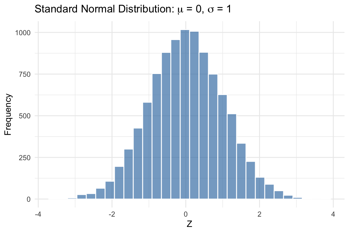 The standard normal is important because any normal random variable can be converted to a standard normal through standardization. If \(X \sim N(\mu, \sigma^2)\), then: